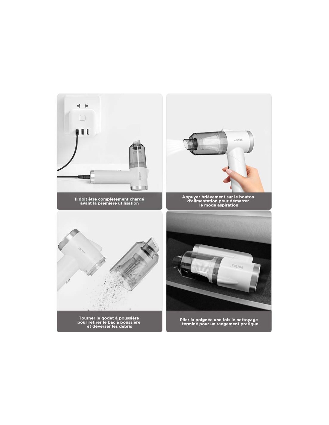 Découvrez le CRC90 de la marque Vortex, un aspirateur à main pliable sans fil conçu pour faciliter vos tâches d'aspiration quotidiennes. Son design ingénieux permet de le ranger facilement, tandis que son éclairage LED intégré éclaire les petits coins sombres, rendant le nettoyage plus efficace.