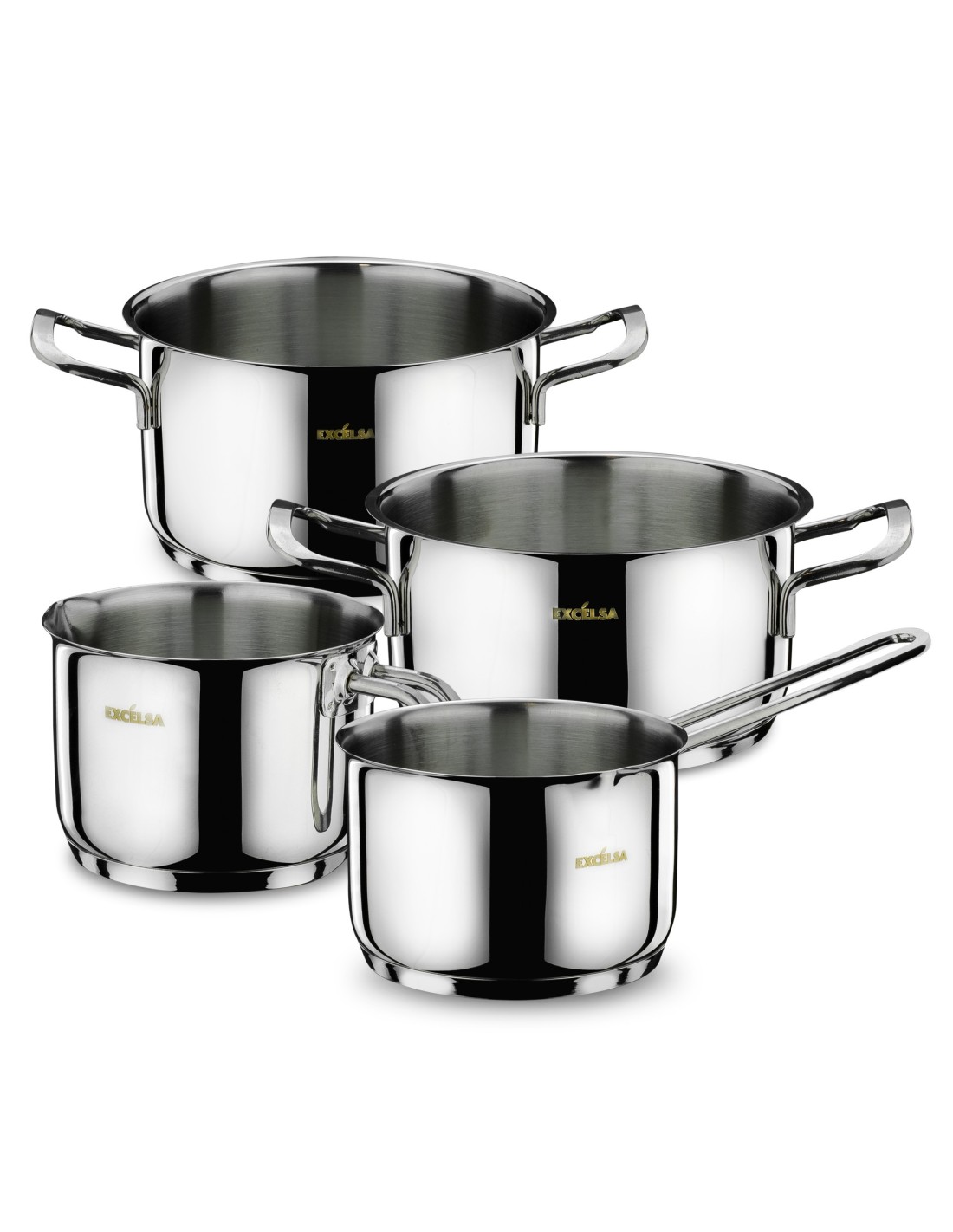 Set de casseroles et faitouts Home Perfect en acier inoxydable, compatibles tous feux dont induction, faciles à nettoyer et au lave-vaisselle, pour une cuisson uniforme et performante.