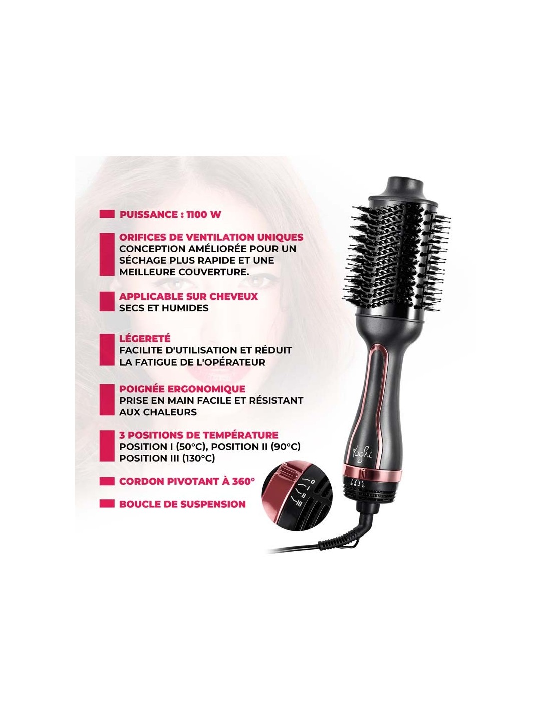 Séchez, coiffez et donnez du volume à vos cheveux qu'ils soient secs ou humides sans les abîmer avec la Brosse 3 en 1 AIR PRO2 de Yoghi