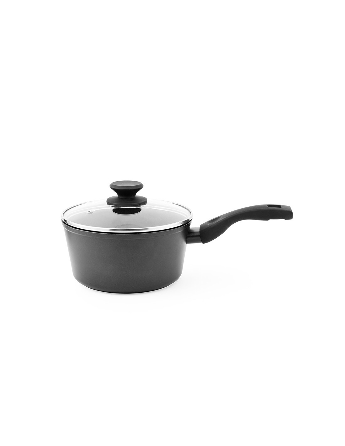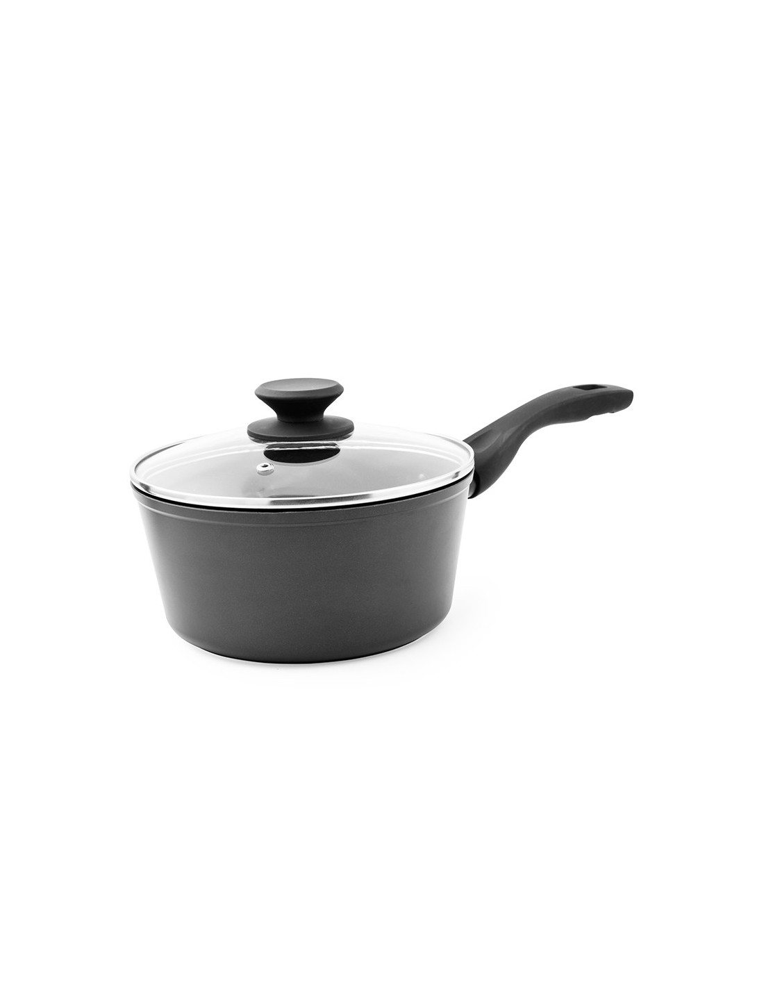 Cette casserole Noa de KitchenCook noire en aluminium forgé permet de garder une chaleur homogène pendant la cuisson et sans adhérence.