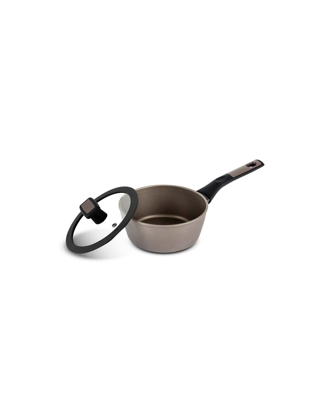 La casserole TREE de 20cm de diamètre est dotée d'une poignée ergonomique en bakélite pour un toucher doux et d'un couvercle en verre trempé et silicone pour une visualisation facile lors de la cuisson.