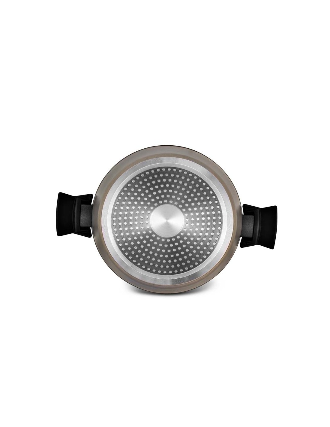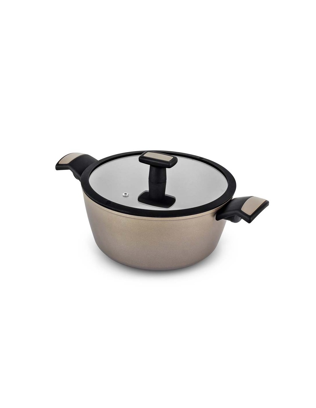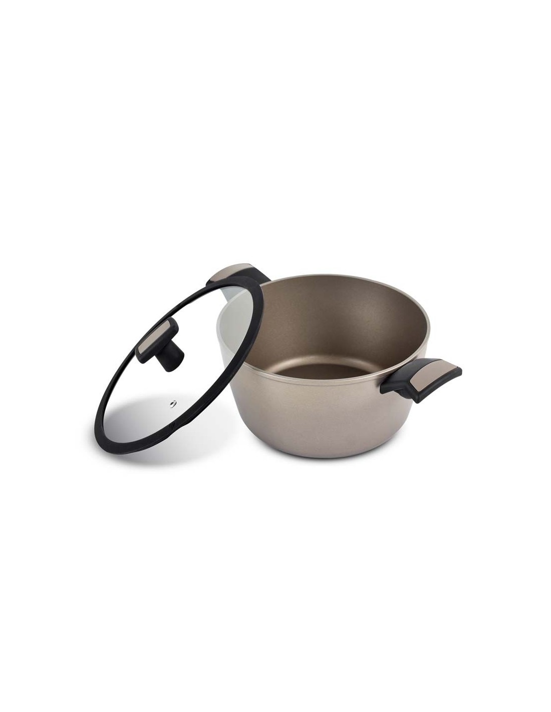 Le faitout TREE de 28cm de diamètre est doté de poignées ergonomiques en bakélite pour un toucher doux et d'un couvercle en verre trempé et silicone pour une visualisation facile lors de la cuisson.