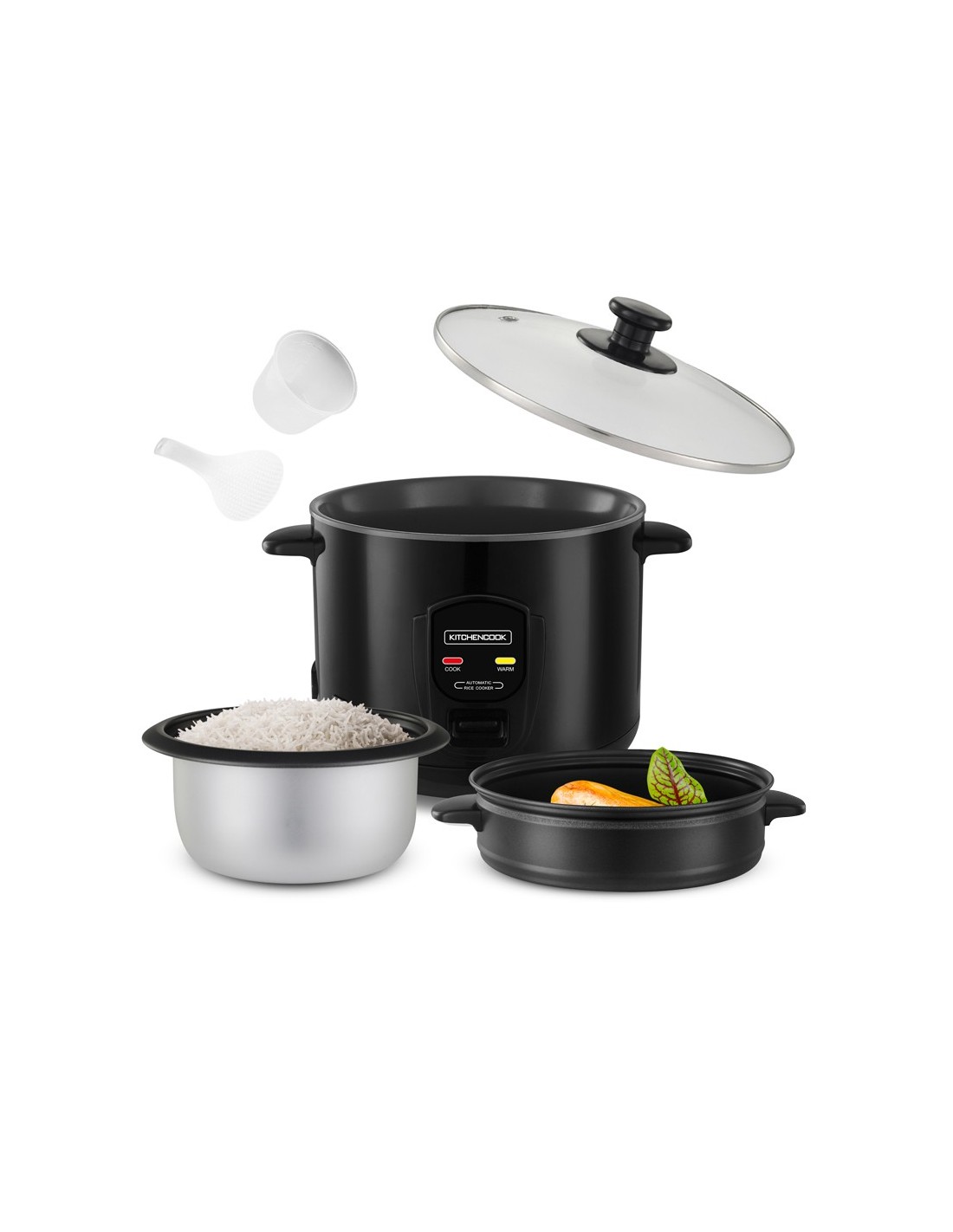 En ce qui concerne les accessoires, ce cuiseur à riz est livré avec un panier vapeur pour une cuisson simultanée de légumes, volailles ou poissons, une cuillère de mesure pour des proportions précises et un verre mesureur pour une utilisation facile.