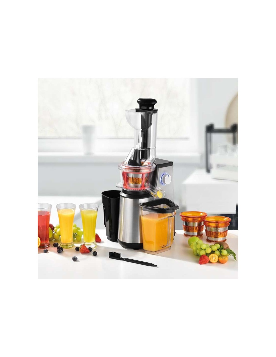 Les accessoires du produit : L'extracteur de jus ULTIMATE INOX de KitchenCook comprend plusieurs accessoires : le poussoir en ABS, la brosse de nettoyage en, les récipients à jus et à pulpes 1L en ABS