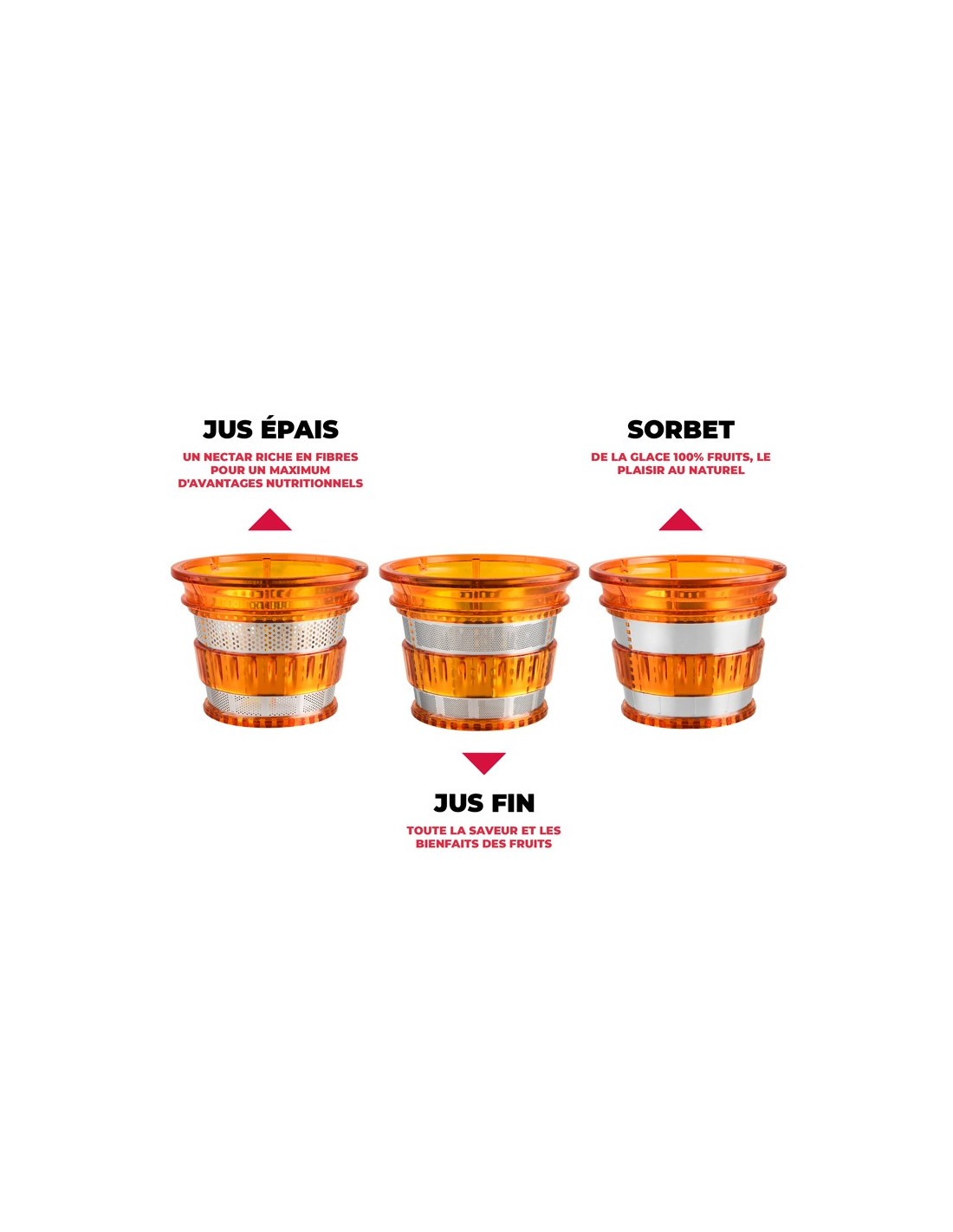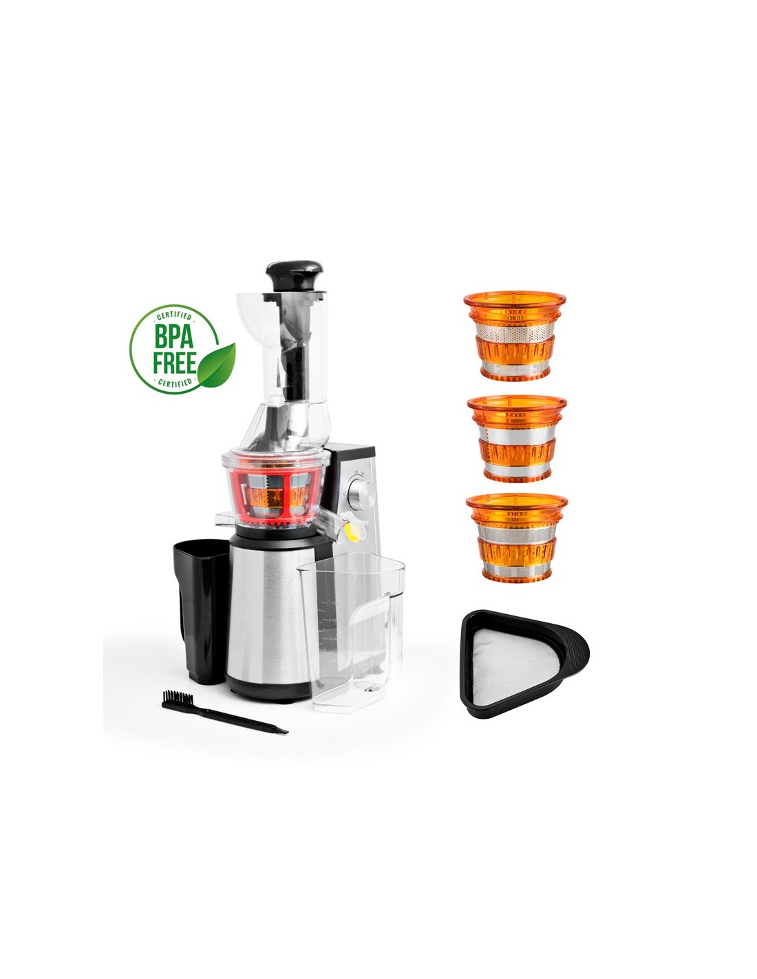 2 sorties : Une sortie plus large pour collecter le jus et une seconde sortie pour collecter la pulpe. Il est fourni avec 2 récipients dont un filtre amovible en acier inoxydable et plastique pour collecter le jus et la pulpe simultanément afin d'obtenir un jus homogène, limpide et sans résidus.