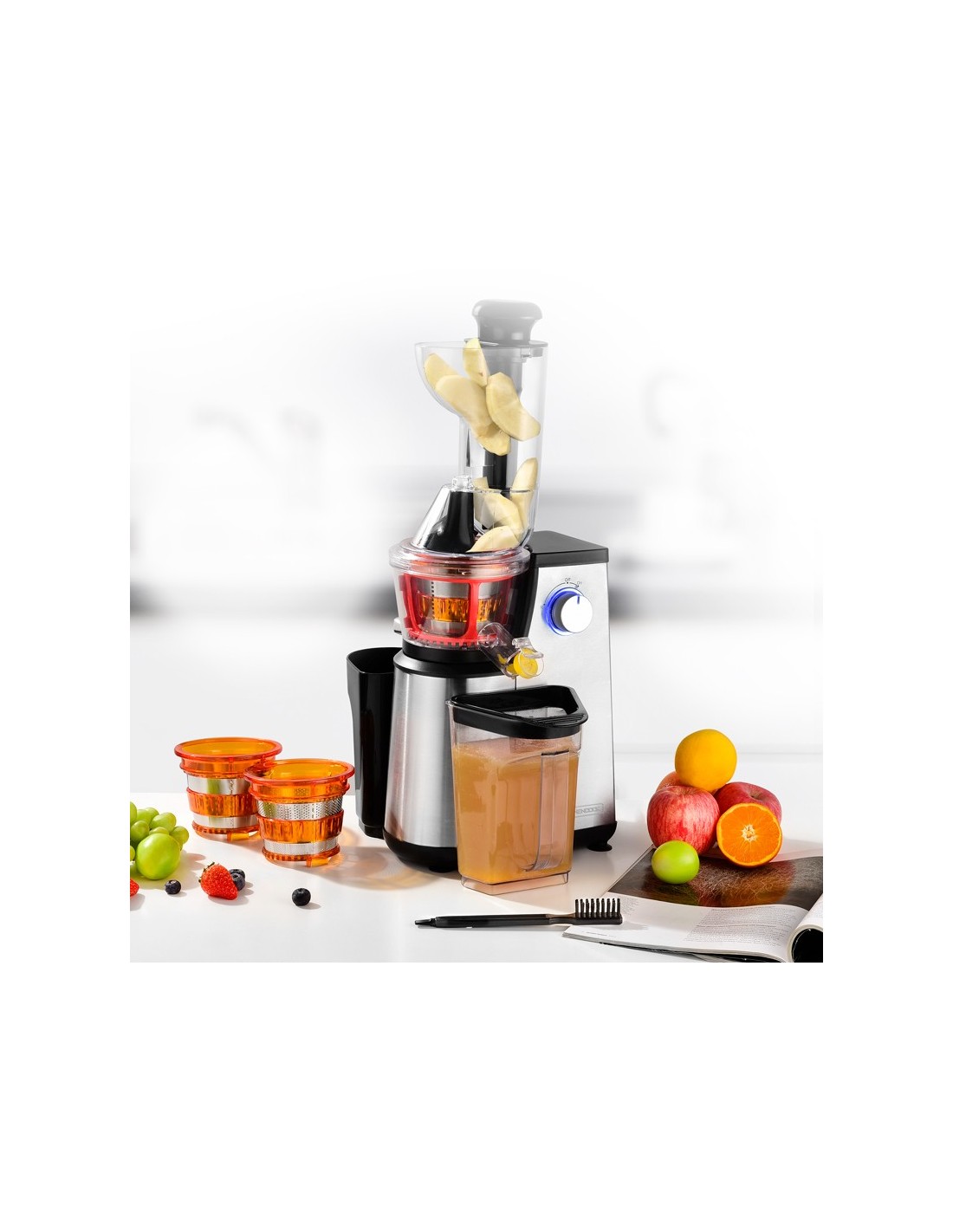 2 sorties : Une sortie plus large pour collecter le jus et une seconde sortie pour collecter la pulpe. Il est fourni avec 2 récipients dont un filtre amovible en acier inoxydable et plastique pour collecter le jus et la pulpe simultanément afin d'obtenir un jus homogène, limpide et sans résidus.
