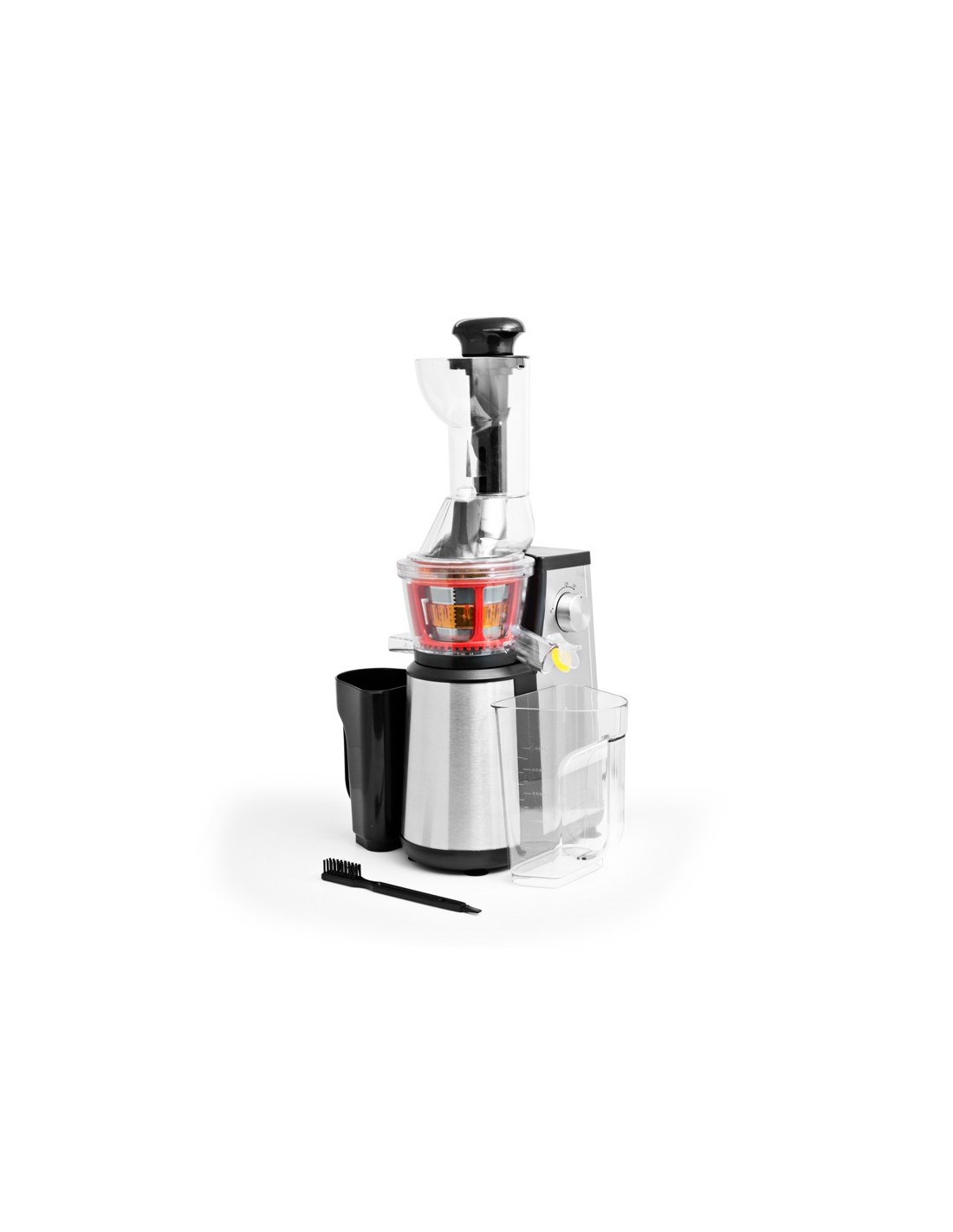 Les accessoires du produit : L'extracteur de jus ULTIMATE INOX de KitchenCook comprend plusieurs accessoires : le poussoir en ABS, la brosse de nettoyage en, les récipients à jus et à pulpes 1L en ABS