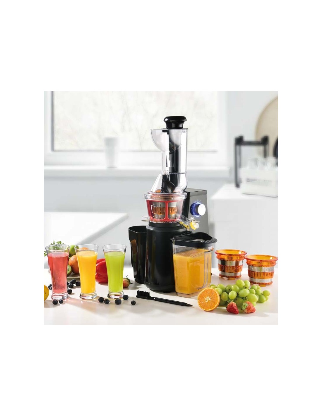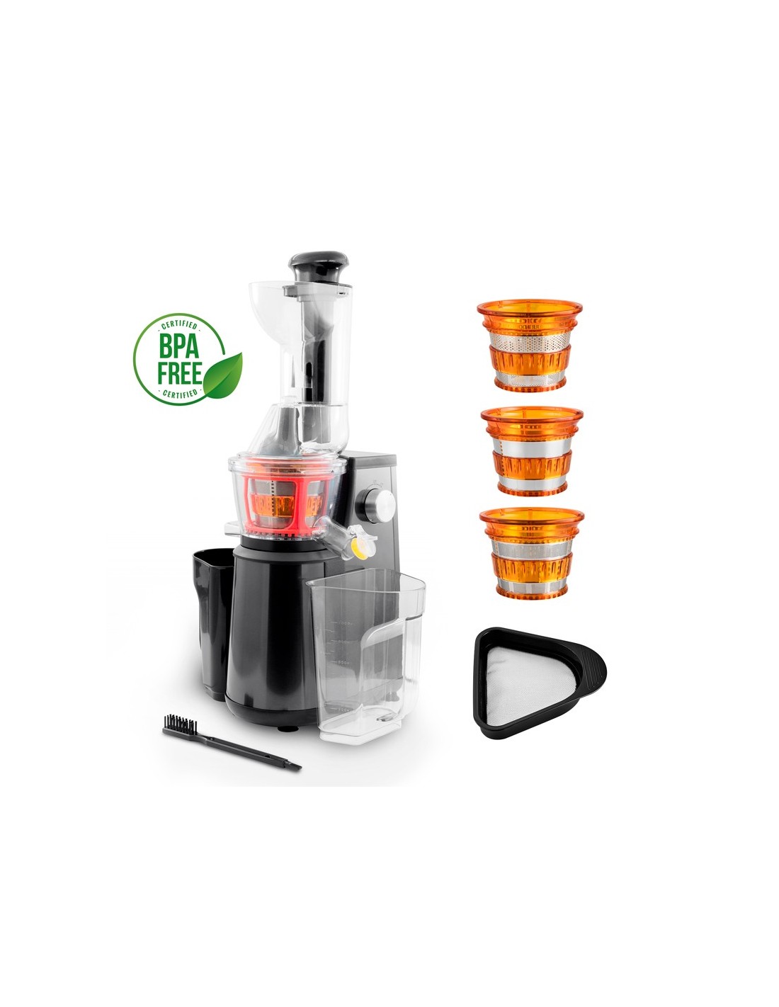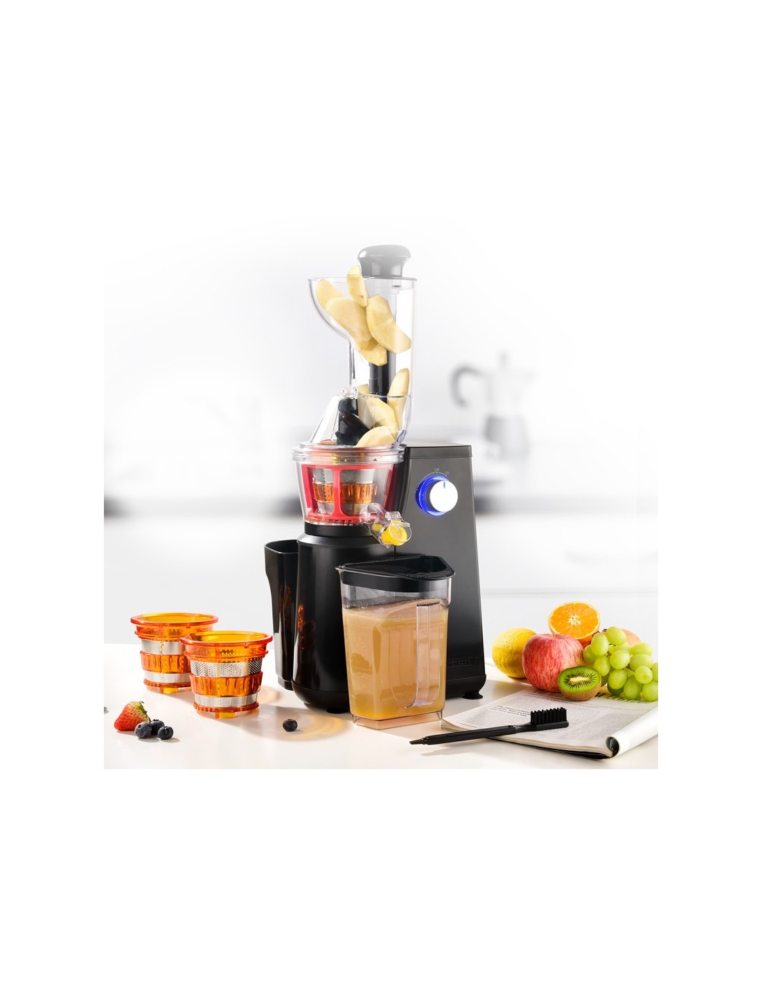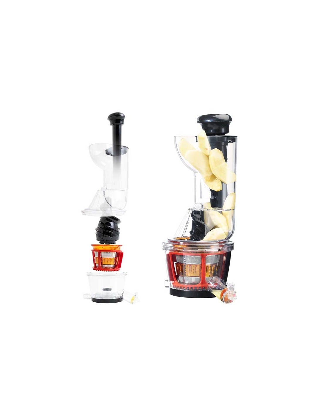 2 sorties : Une sortie plus large pour collecter le jus et une seconde sortie pour collecter la pulpe. Il est fourni avec 2 récipients dont un filtre amovible en acier inoxydable et plastique pour collecter le jus et la pulpe simultanément afin d'obtenir un jus homogène, limpide et sans résidus.