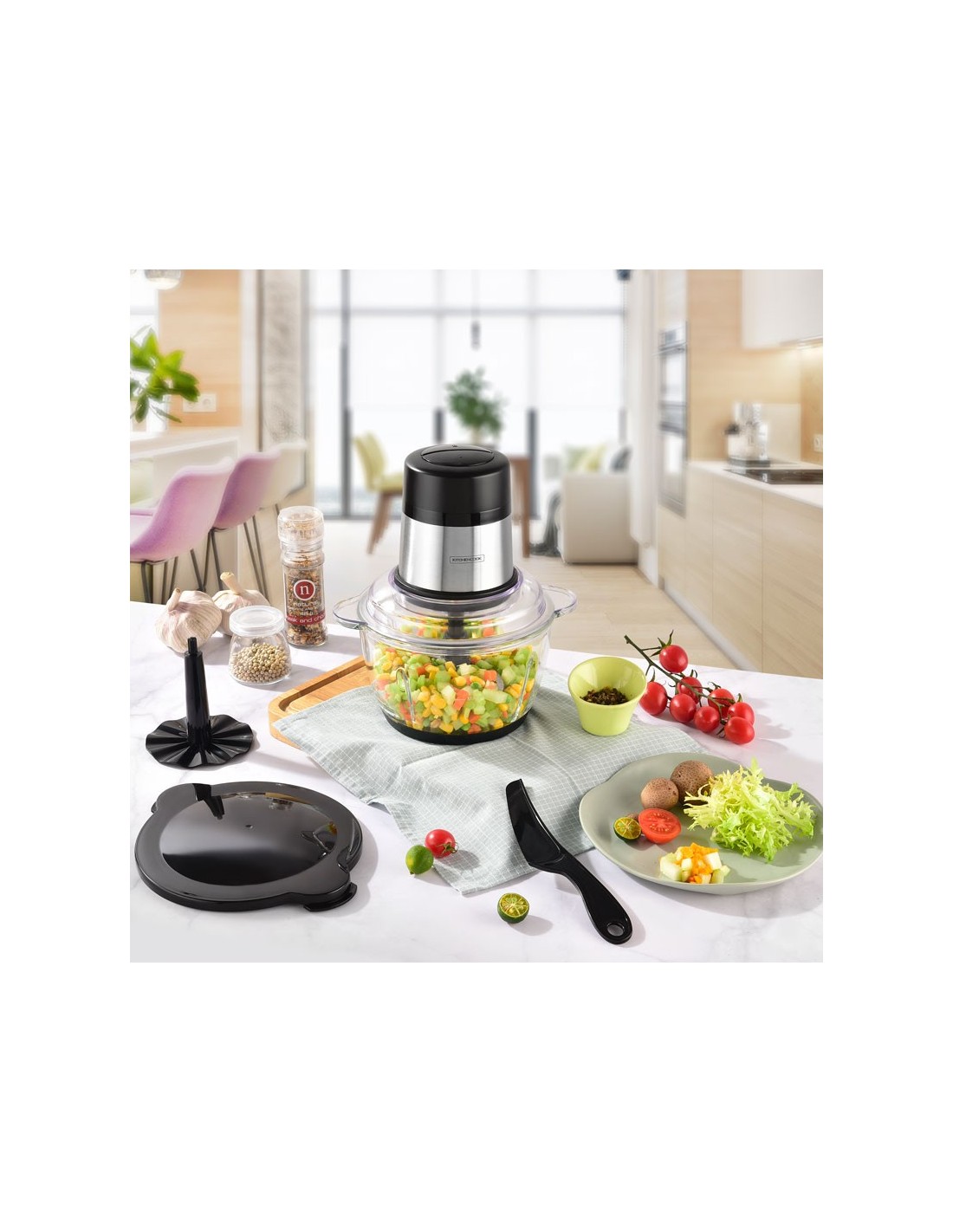 - Accessoires fournis : spatule, couvercle, fouet, lame inox