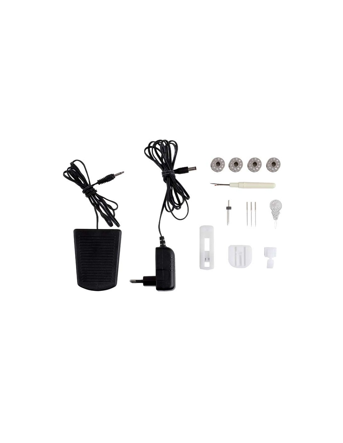 - Accessoires inclus : Bobines x4, 14 aiguilles X3, double aiguille x1, enfile aiguille x1, plaque de couture de bouton x1, pied de biche à boutonnière x1, 1x pied de biche pour fermeture à glissière, découseur x1, adaptateur x1, pédale de commande x1, broche porte bobine x1