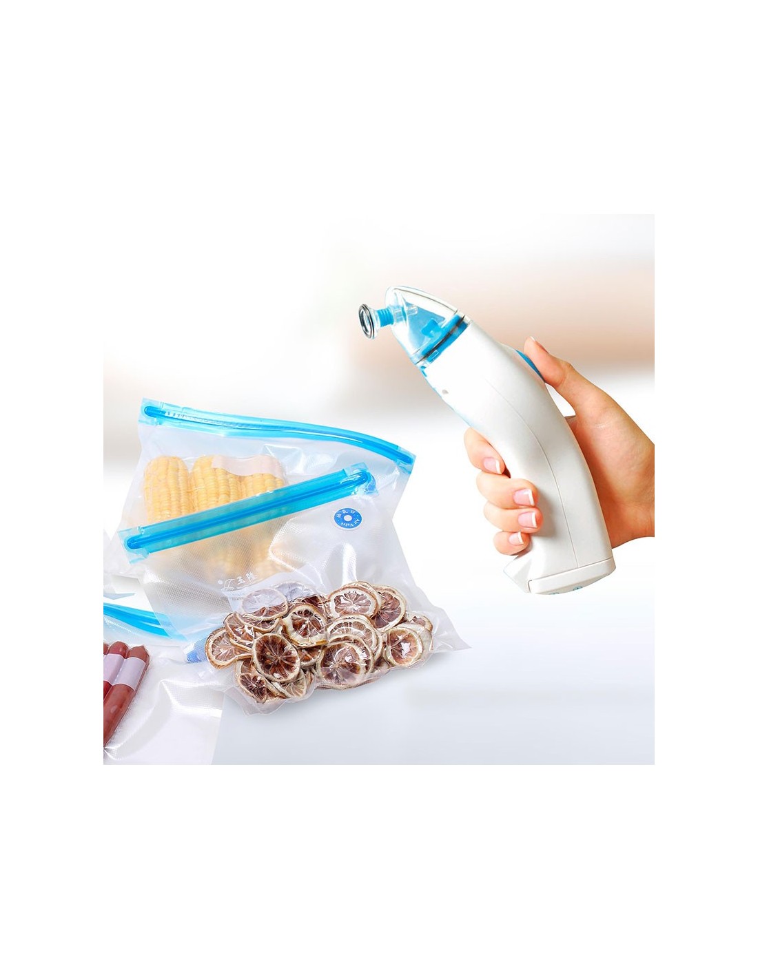 - Fonctionne sur piles (non fournies) - Livré avec 5 sacs réutilisables avec zip (3 sacs de 220x210 mm et 2 sacs de 260 x 280 mm Idéale pour conserver des viandes, poissons, fruits, légumes, produits secs... la machine sous vide SLIM&SEAL de Conservair se complète avec les accessoires BOTTLESEAL, SEALTOP et SEALBOX2 de la même marque.