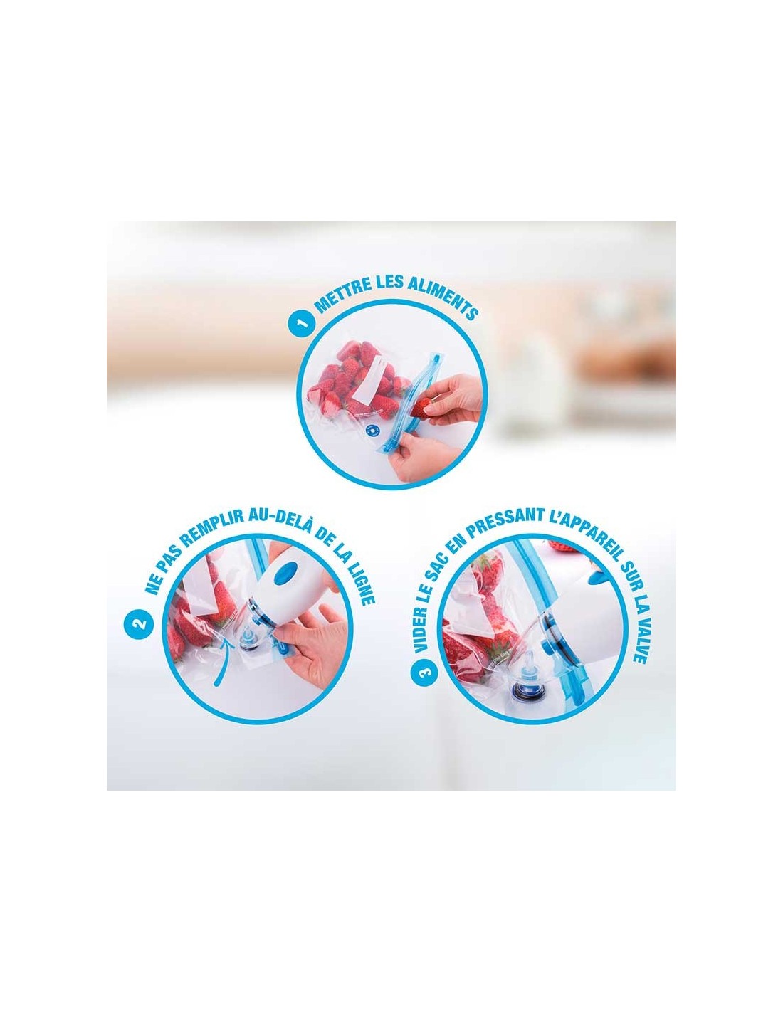 - Fonctionne sur piles (non fournies) - Livré avec 5 sacs réutilisables avec zip (3 sacs de 220x210 mm et 2 sacs de 260 x 280 mm Idéale pour conserver des viandes, poissons, fruits, légumes, produits secs... la machine sous vide SLIM&SEAL de Conservair se complète avec les accessoires BOTTLESEAL, SEALTOP et SEALBOX2 de la même marque.