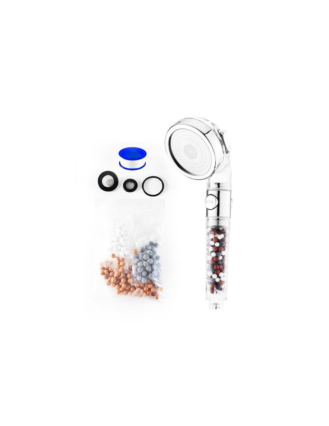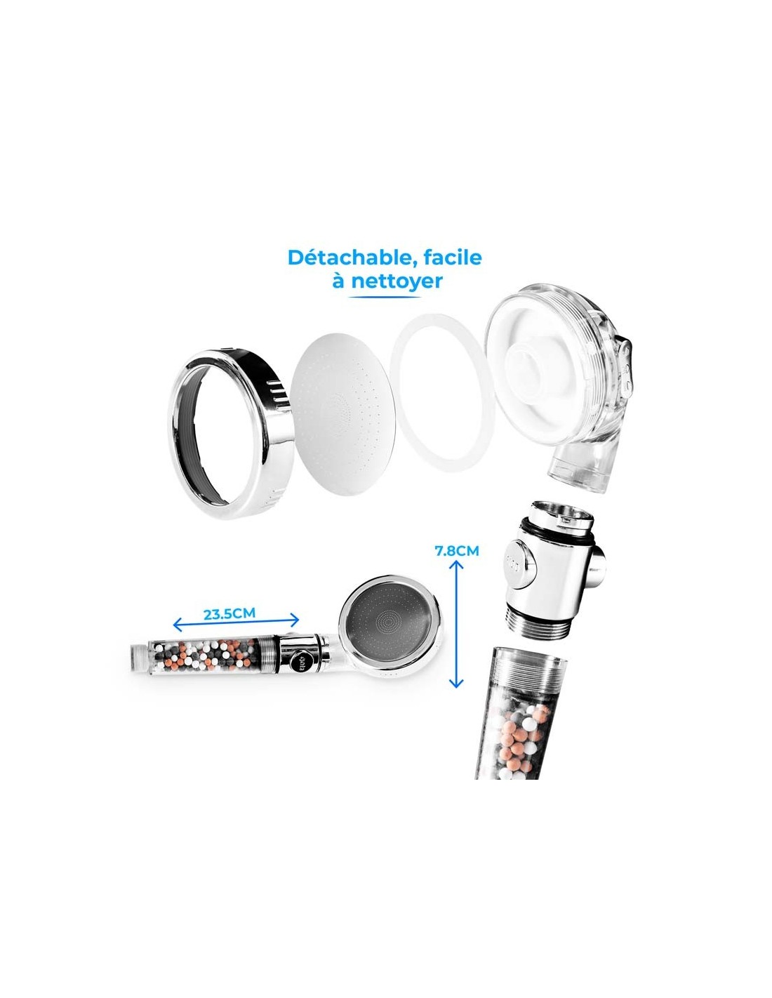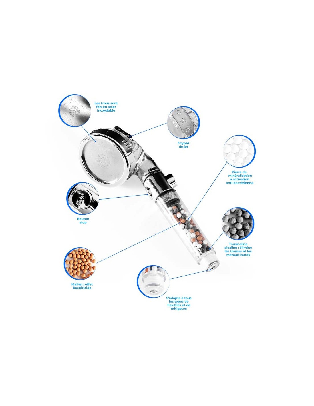 - Livré avec : ruban en téflon, boules filtrantes (dans le pommeau), une recharge dans un sachet séparé, 2 * joints d'étanchéité et un joint économiseur d'eau.