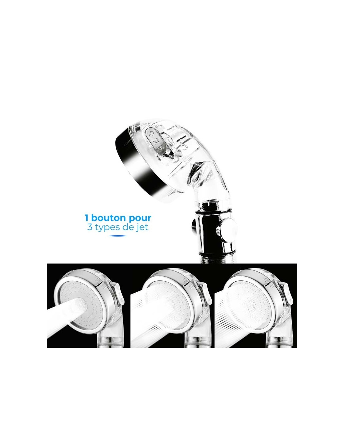 Son interrupteur à bascule vous permettra de basculer entre 3 types de jets (pluie, massage et tonique) selon vos besoins ou vos envies, de plus la poignée ergonomique du pommeau vous garantira une prise en main confortable.