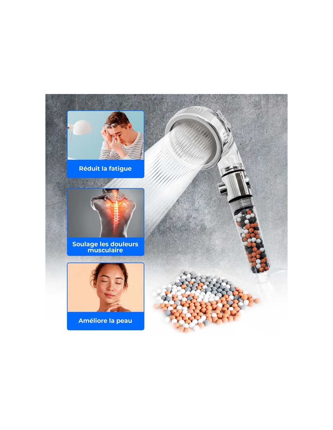 - Billes grises : Tourmaline alcaline : la tourmaline élmine les toxines et les métaux lourds présents dans l'eau, rendant l'eau du robinet plus propre et douche pour la peau