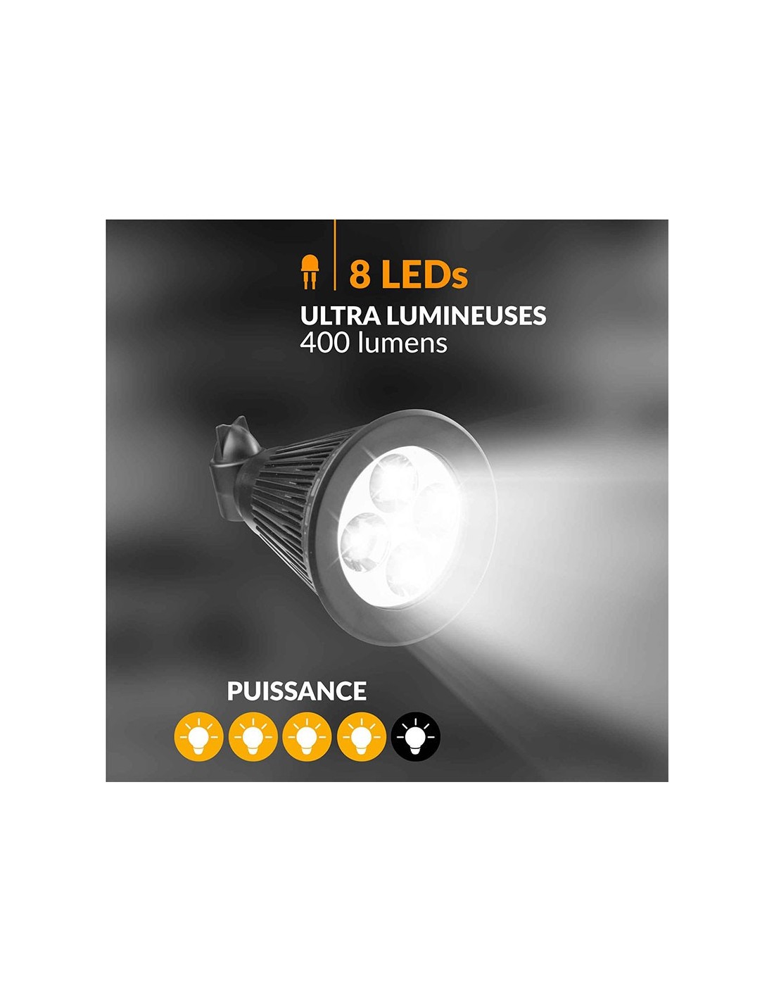 Ensuite, ce n’est qu’une fois la nuit tombée que les 8 LEDS extra-brillantes blanches de 2 x 200 Lumens entreront automatiquement en jeu.