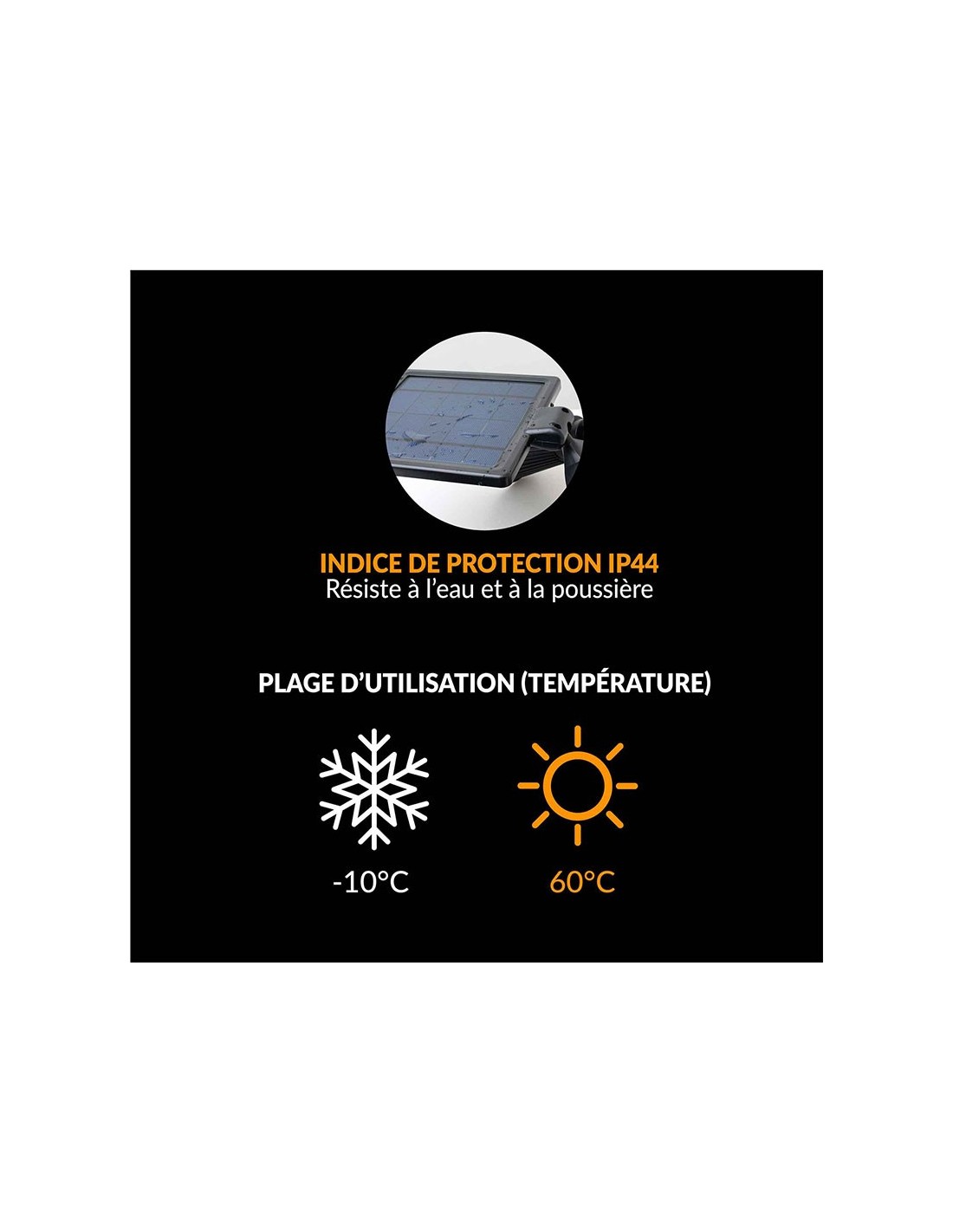 Le projecteur est muni d’un panneau solaire orientable (pivote à 90°C). Ce dernier vous laisse ainsi le choix de l’inclinaison et de la place la plus appropriée à la réception d’énergie solaire.
