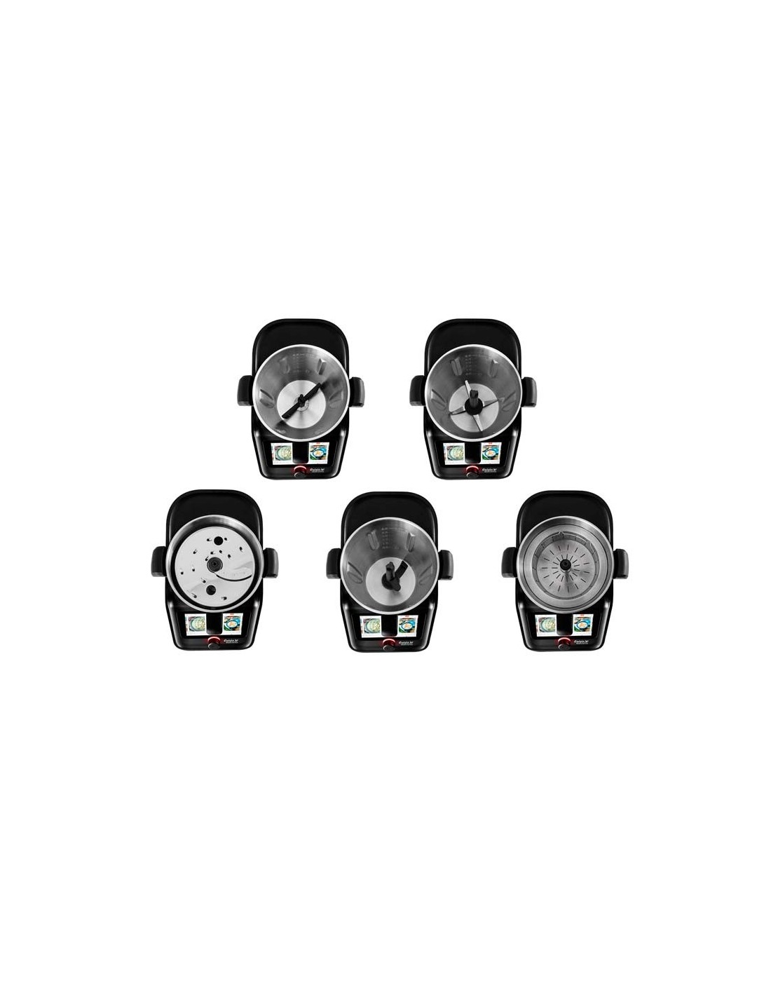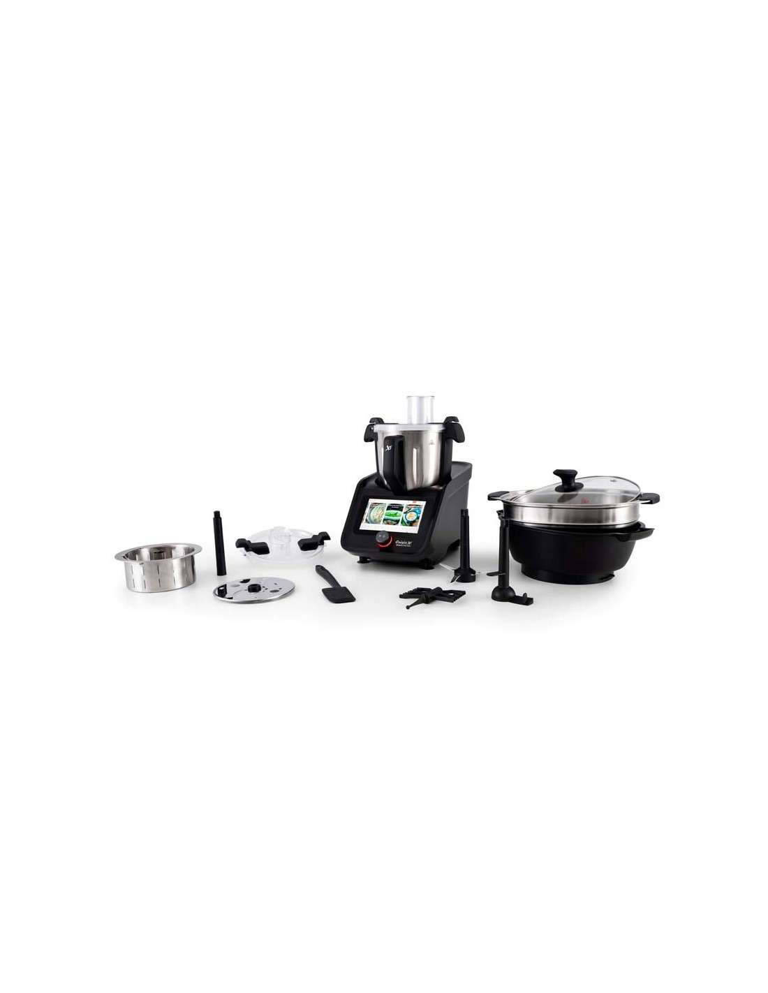 Accessoires : bol en acier inoxydable, 2 couvercles en plastique, panier vapeur, plateau vapeur, fouet, lame en acier inoxydable, spatule en silicone, poussoir, disque à râper/émincer en inox.
