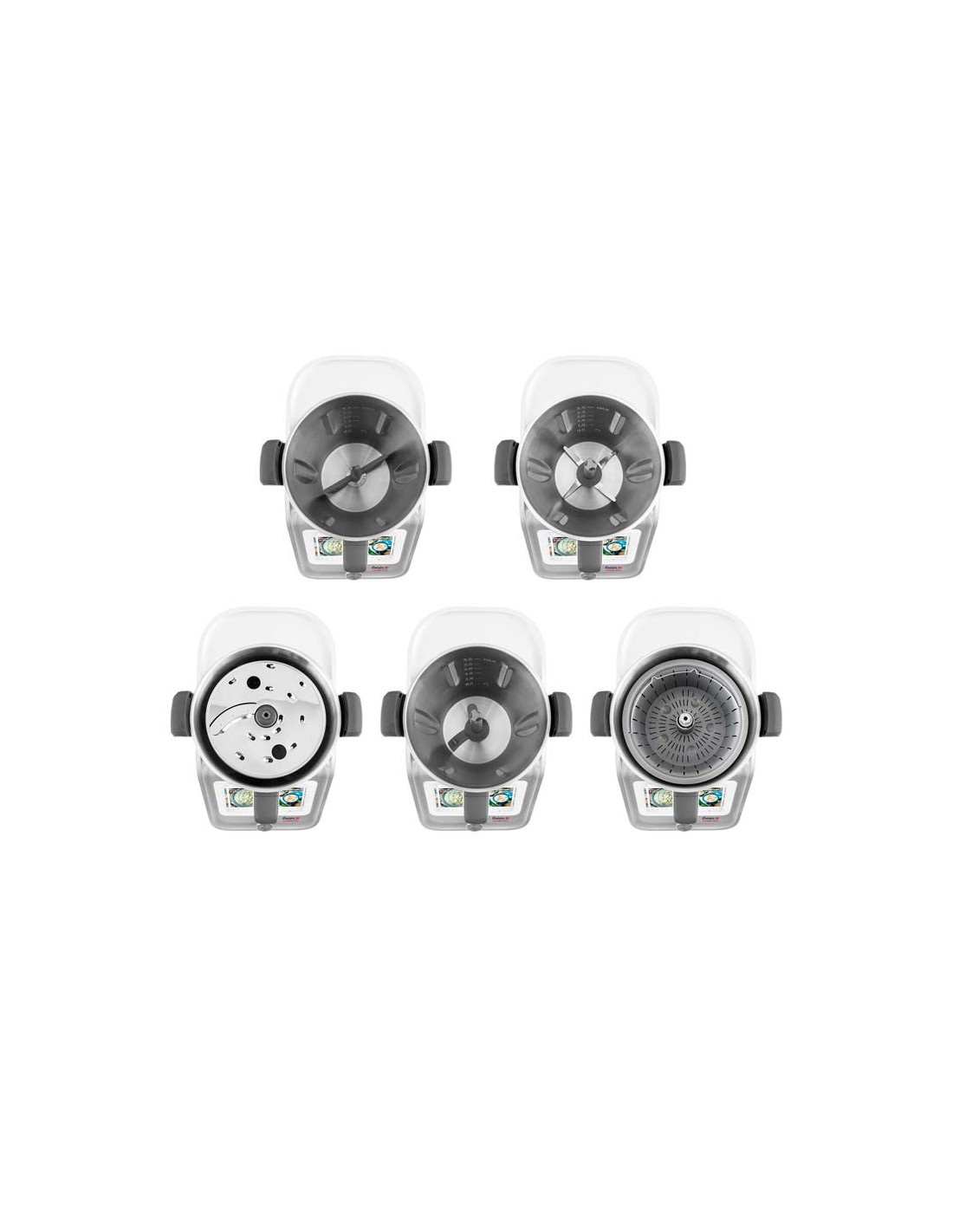 Accessoires : bol en acier inoxydable, 2 couvercles en plastique, panier vapeur, plateau vapeur, fouet, lame en acier inoxydable, spatule en silicone, poussoir, disque à râper/émincer en inox.