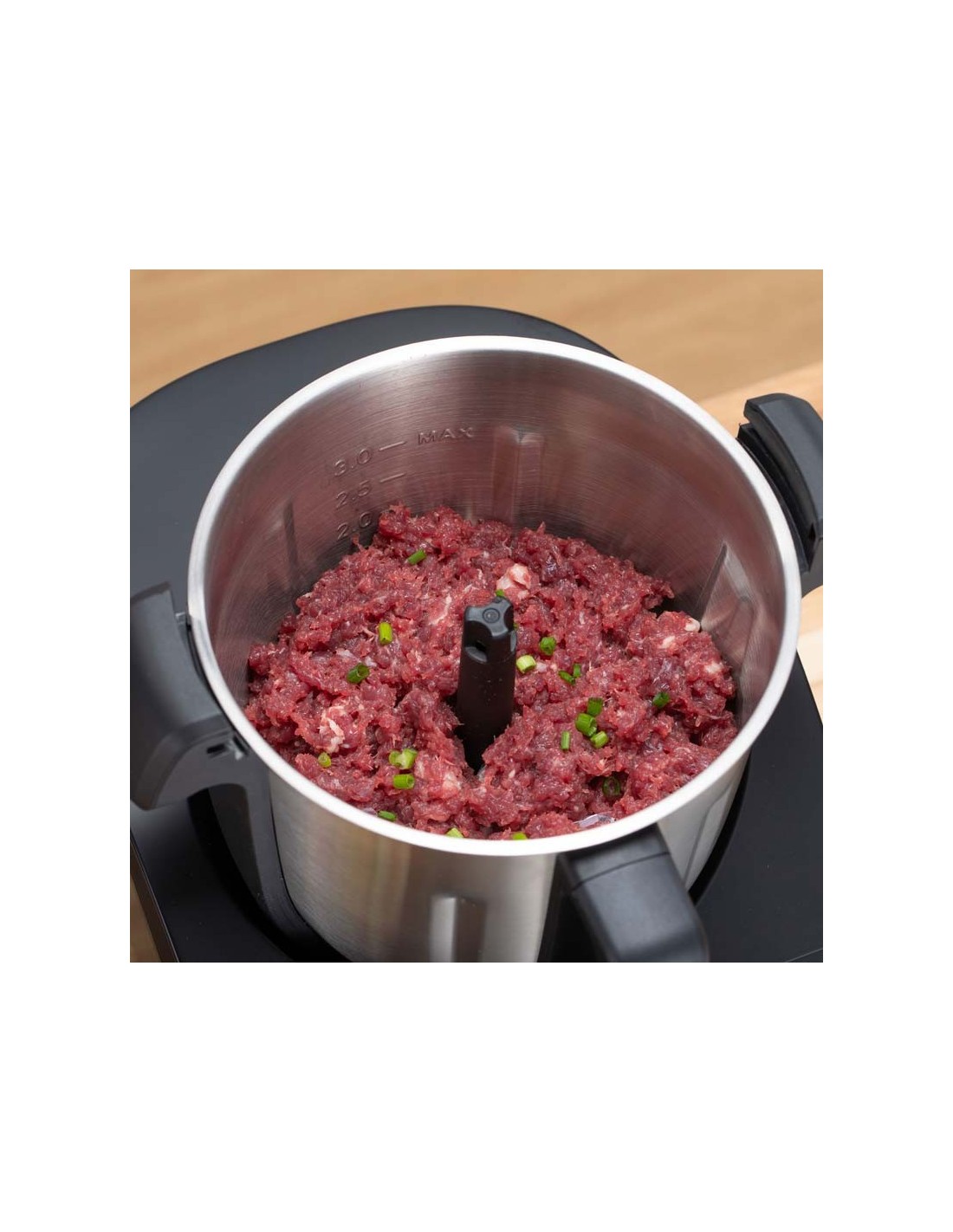 • Accessoires inclus : Verre doseur, bol en acier inoxydable avec 2 couvercles en plastique, panier vapeur, plateau vapeur, fouet, lame en acier inoxydable, spatule en silicone, poussoir, disque à râper/émincer en inox